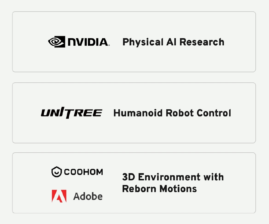 Research Collaborators: We work closely with leaders in physical AI, including NVIDIA, Adobe, and Coohom, to co-develop advanced humanoid control policies, real-time simulation tools, and environments grounded in Reborn’s diverse motion datasets.