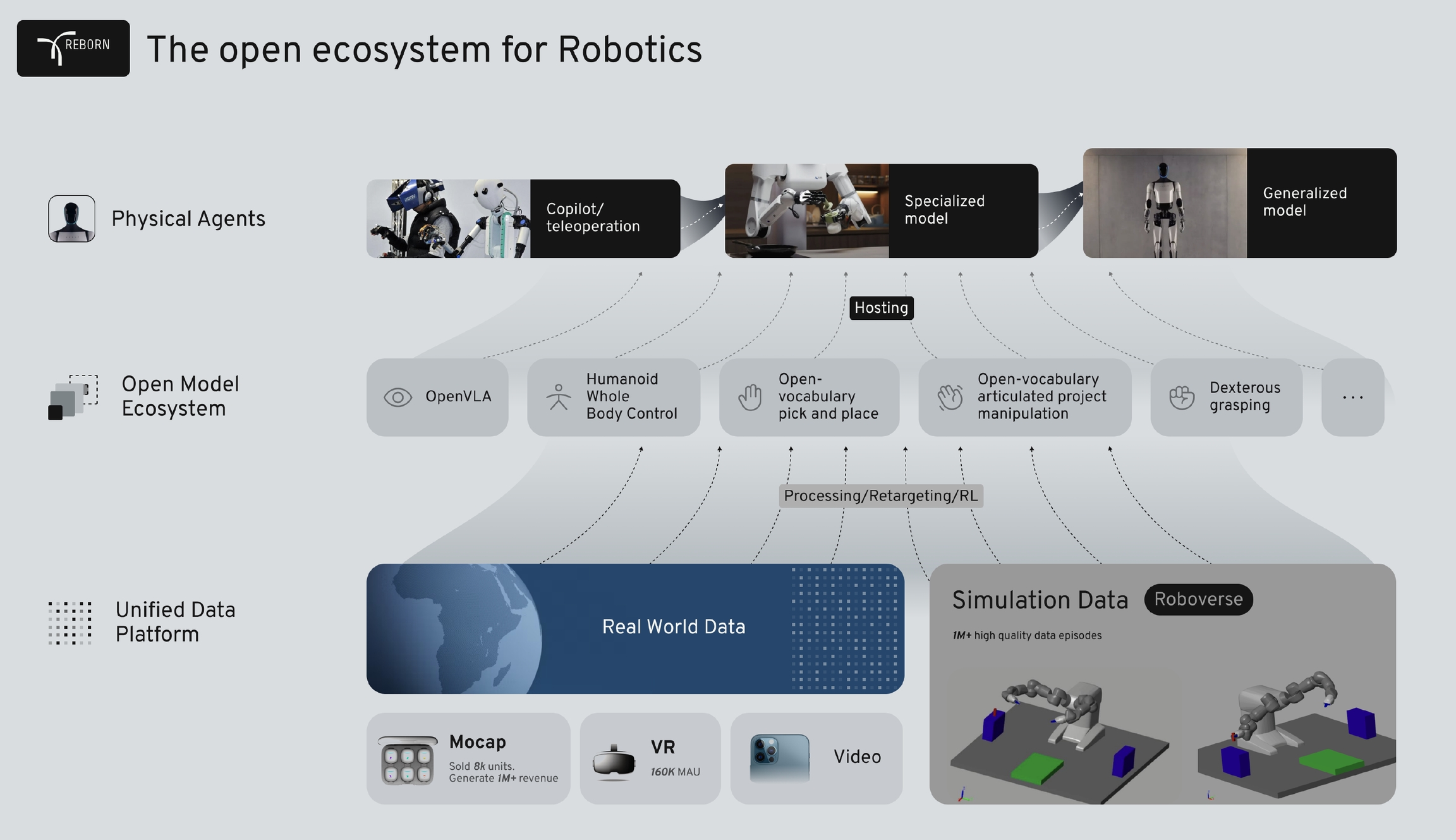 Open Model Ecosystem: A growing library of reusable embodied AI models—including OpenVLA, whole-body controllers, and dexterous manipulators—that can be deployed instantly or extended by developers through the Reborn Physical AI App Store.